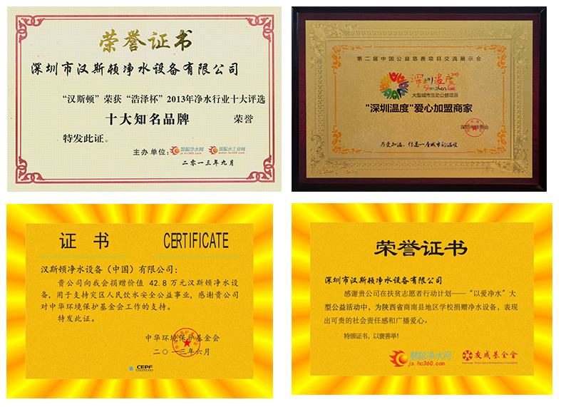 漢斯頓始終以誠(chéng)信慈善為立身之本,足跡遍布大江南北;母親水窖工程、捐資助學(xué)活動(dòng)、天天凈水活動(dòng)、無(wú)私奉獻(xiàn)活動(dòng)(雅安地震物資捐贈(zèng))、萬(wàn)企公益捐贈(zèng)活動(dòng)等,為缺水、貧困山區(qū)、災(zāi)區(qū)的孩子送去溫暖的陽(yáng)光,于2013年榮獲"中華環(huán)境保護(hù)基金會(huì)愛(ài)心慈善家"、"深圳溫度愛(ài)心加盟商家"等獎(jiǎng)項(xiàng)。